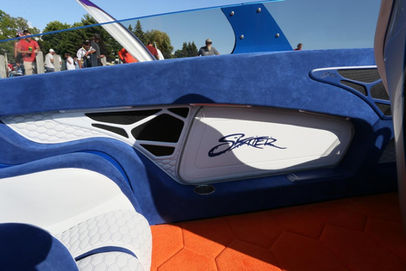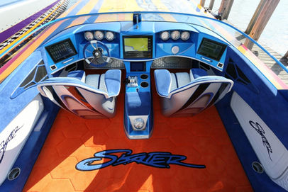 All of the ravings on our 388 instilled a desire to build a new 388 on steroids. Size wise, the 438 is a 10% enlargement of the 388. 10% deeper tunnel, 10% longer running surface, 10% wider sponson, 10% wider tunnel, etc., etc., etc. However for many years now, we had been thinking of a radical bottom design change that would give the boat outstanding rough water capabilities along with an improved top end performance along with tremendous range and load carrying capacity. It is well-known that a fully loaded cat or V suffers a performance loss under these conditions, one reason why our competitors offer fuel capacities that are a third to a half of what Skater offers. Well, the bar has been set higher once again. The 438 will run at very high speeds with 1350 Mercruiser engines and fully loaded with both passengers and 600 gallons of fuel. Now, that’s impressive! A long running surface and a 12’+ beam allow this boat and others above 38’ to accommodate our ultra-wide cockpit with comfortable seating for 8-9 adults.