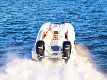 For those that like the user-friendly attributes of an outboard boat but want to step up into the 30’+ size range, the 308 Skater is the boat to have. It has all the great performance qualities of the venerable 28, in a scaled-up package that provides a more comfortable ride in rougher waters. The sleek deck fairing with raiseable windshields at the touch of a button provide the best of both worlds – wind in your face good times when you want it, and protection from the wind when you need it. The cockpit has seating for 5, with a large molded-in rear hatch for storage in the back. Mercury Racing’s venerable 400Rs are the motors of choice for this model, providing speeds of up to 120mph and a range of over 500 miles with the standard 100-gallon fuel tanks. The 308 raised the bar for outboard powered catamarans, and with today’s new outboards is even better than ever.