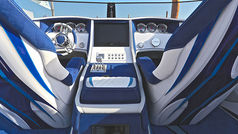 All of the ravings on our 388 instilled a desire to build a new 388 on steroids. Size wise, the 438 is a 10% enlargement of the 388. 10% deeper tunnel, 10% longer running surface, 10% wider sponson, 10% wider tunnel, etc., etc., etc. However for many years now, we had been thinking of a radical bottom design change that would give the boat outstanding rough water capabilities along with an improved top end performance along with tremendous range and load carrying capacity. It is well-known that a fully loaded cat or V suffers a performance loss under these conditions, one reason why our competitors offer fuel capacities that are a third to a half of what Skater offers. Well, the bar has been set higher once again. The 438 will run at very high speeds with 1350 Mercruiser engines and fully loaded with both passengers and 600 gallons of fuel. Now, that’s impressive! A long running surface and a 12’+ beam allow this boat and others above 38’ to accommodate our ultra-wide cockpit with comfortable seating for 8-9 adults.